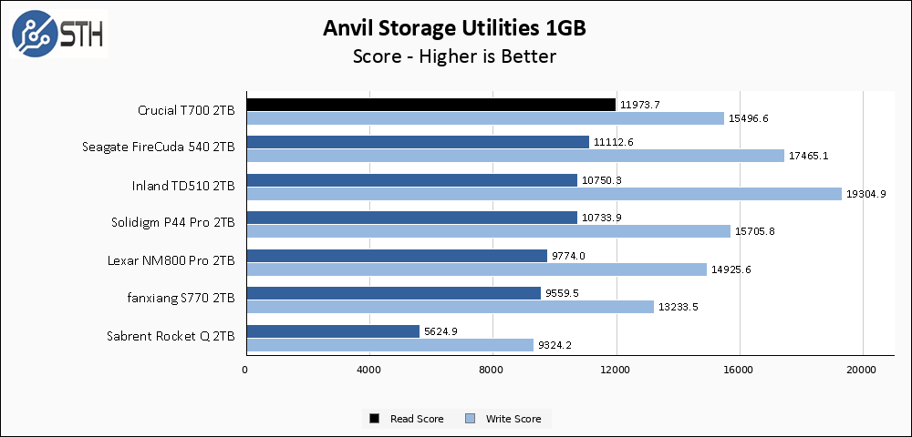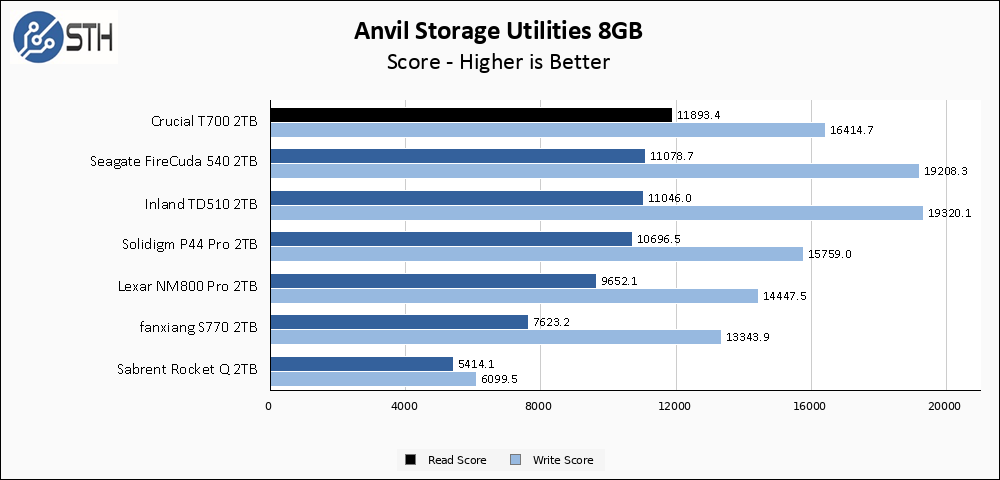 The larger Anvil test has the T700 shows very similar results to the smaller test, with the T700 leading the entire group on read score but coming in a bit slower than the other Gen 5 drives in my test bench for writing, again due to high queue depth random write tests.