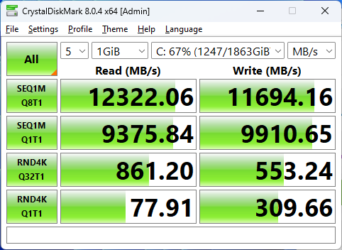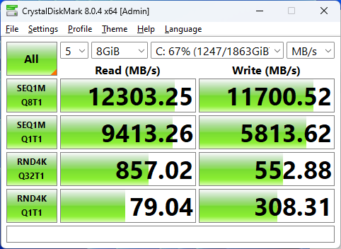 AS SSD results mirror Anvil almost perfectly. The T700 is the king of read performance, but slower multithreaded random writes hold back the write score compared to the other Gen 5 drives in my test suite.