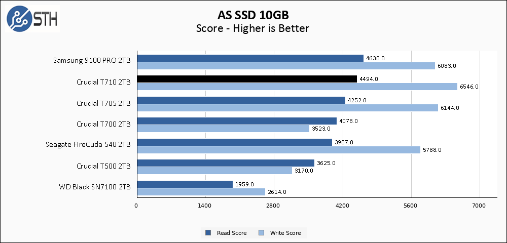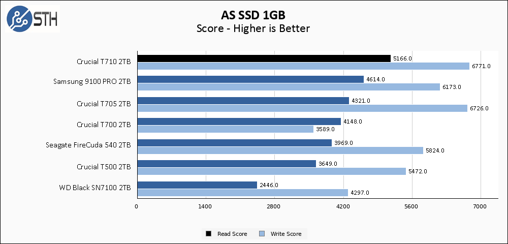 The larger AS SSD test shows the T710 give some ground in read performance, but holds strong for writes. Overall the T710 is the fastest drive I have tested in AS SSD.