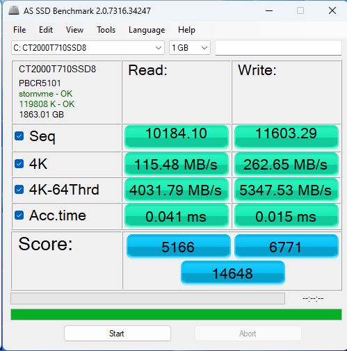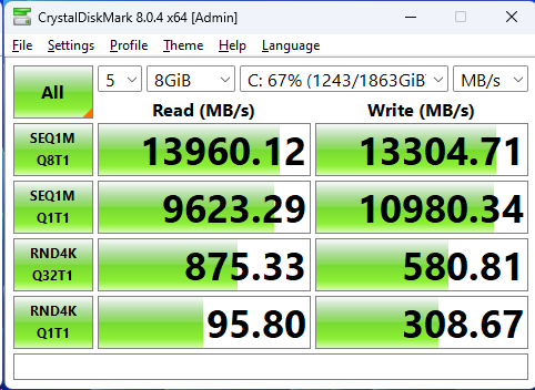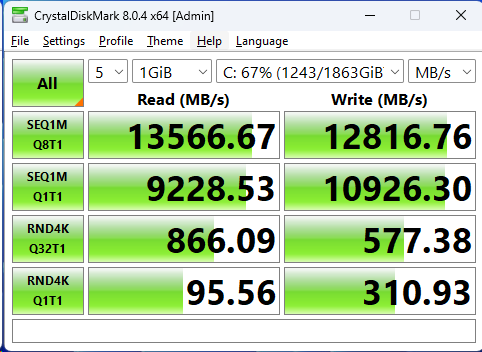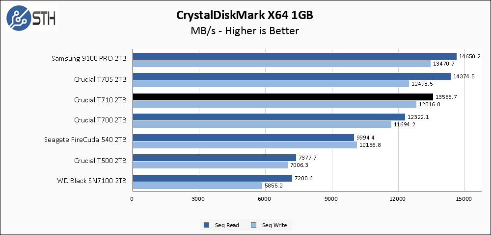 The Crucial T710 2TB promised 14500 MB/s read and 13800 MB/s write, but I did not quite get there in my testing. Both read and write performance were slightly below rated, and perhaps importantly were below both the T705 and the 9100 PRO. Performance is still great, but just not as great as claimed.