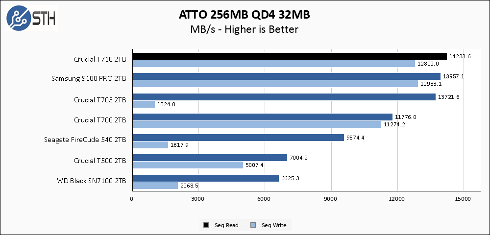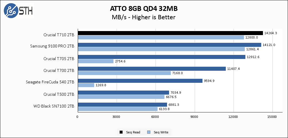 The Crucial T710 is perhaps the first drive I have seen where ATTO sequential results are better than CrystalDiskMark. The T710 does spectacularly well here. Read results are as high as I have ever seen, and write results are very close to the top as well. Just as important, though, is the overall consistency of performance on this test, which is something the T705 struggled with.