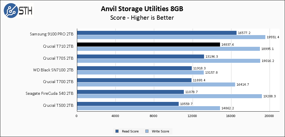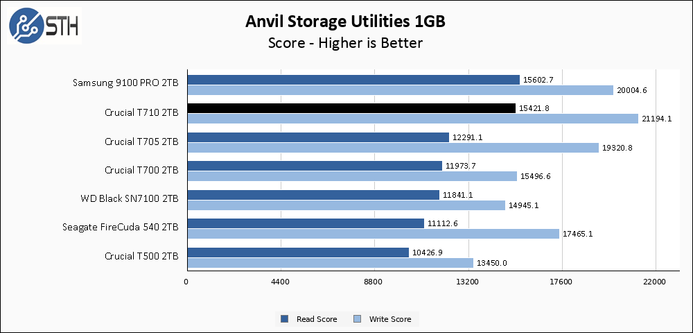 The T710 is awesome in this Anvil test. Read results are almost tied to the Samsung 9100 PRO, and the T710 wins outright in write score. Compared to the previous T705, itself a very fast drive, the T710 turns in a leap in performance on both metrics.
