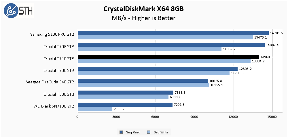The larger CrystalDiskMark test has the T710 turn in strong numbers, particularly on writes, while still falling slightly short of the very lofty rated specs. Write speed against the T705 is significantly improved here, which is great to see, and read speeds are within striking distance.