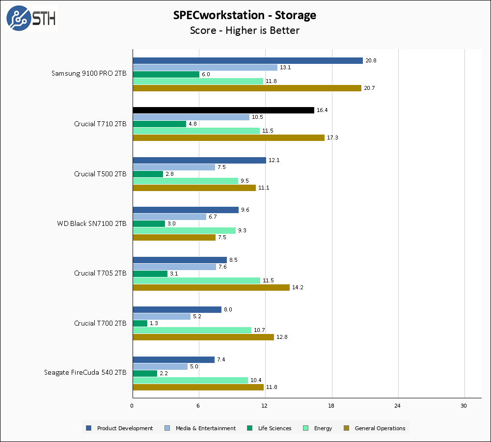 Between the Samsung 9100 PRO and the T710, I may have to rescale SPECworkstation’s results. Both of these drives push SPECworkstation to incredible results, though the T710 does lose slightly compared to the 9100 PRO. The T705 is a distant competitor compared to the new T710. These new Gen5 drives are firmly in Optane territory with these SPEC results.