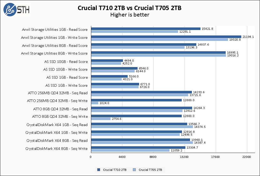 Generally speaking, the T710 does come out on top of the T705 in almost every test. The lone holdouts are in sequential read performance in CrystalDiskMark, but Crucial did not actually make any comparisons to the T705 in that metric, so perhaps this is why. Write performance consistency was dramatically improved compared to the T705, and that is something Crucial claimed.