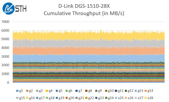 With 28 ports being measured every second for ten minutes, we were able to get a good sense of the performance under a rough SMB scenario (everyone is backing up at once.) Here we saw cumulative performance of around 5.8GB/s which is frankly faster than most SMB storage clusters can handle data. One can see the impact that the four 10Gb ports have providing over half of the aggregate bandwidth of the switch.