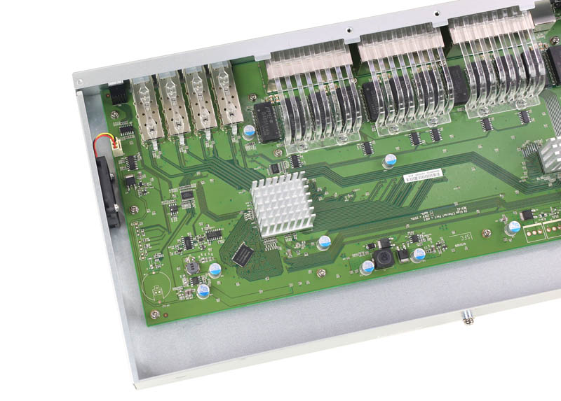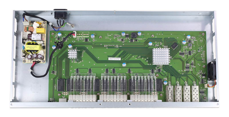 Inside the chassis we find two main PCBs. The leftmost is the power supply. The large PCB is the switch PCB.