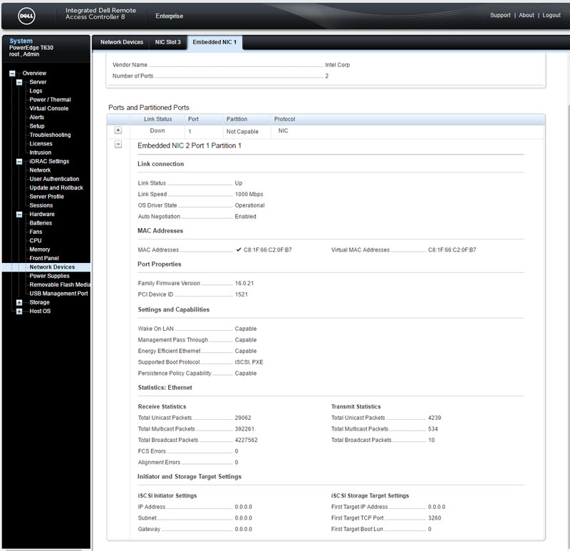 Showing another unique capability of the iDRAC 8 controller, one can see detailed network interface information. As one can see, this spans both the embedded NICs in the motherboard but also add-on NICs as well. While many remote management solutions on the market can provide basic data for embedded NICs (e.g. the MAC address) the ability to show more detailed information and information on add-on cards is a key point of differentiation.