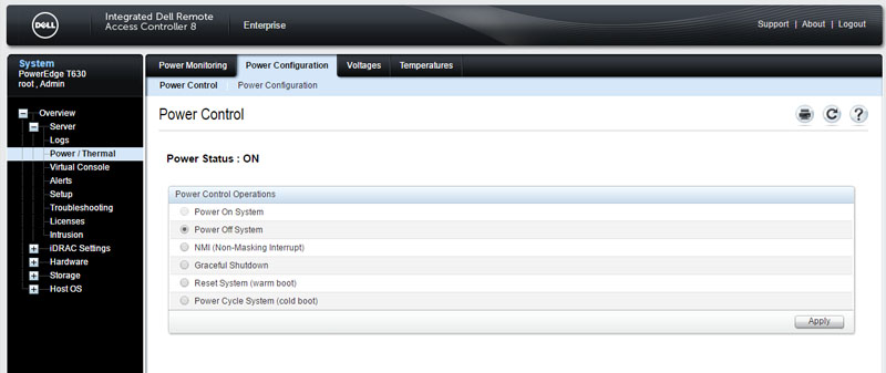 There are a few basic features that every server management solution requires. One of the most basic is monitoring and power control. For individual servers, one may manually power cycle servers. This can be accomplished via the web intervase.