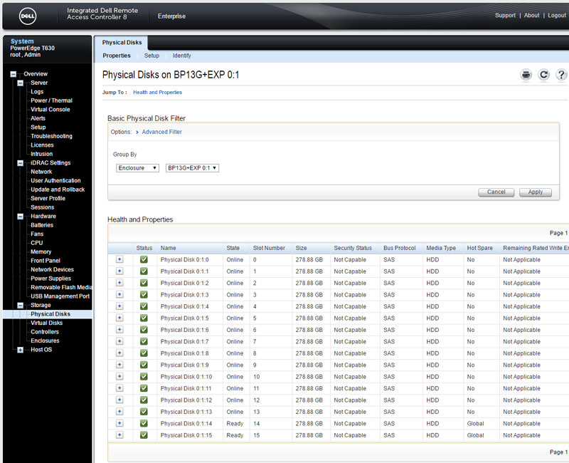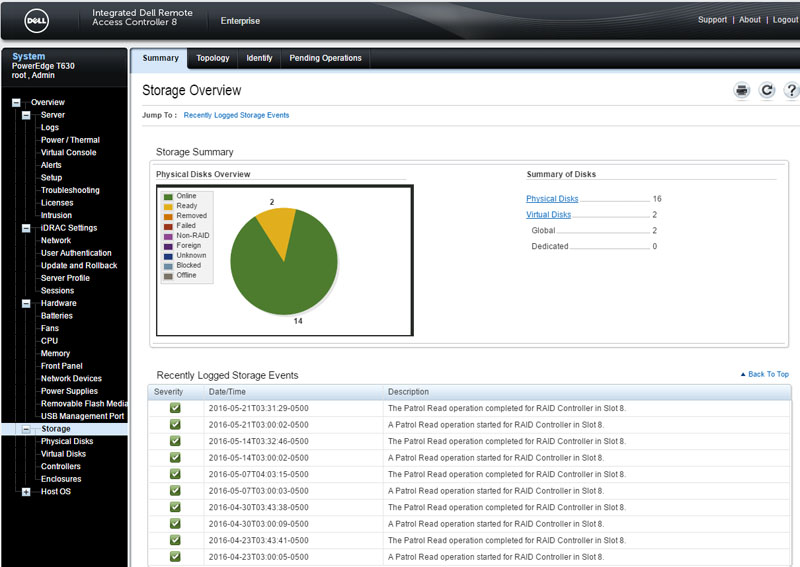 A unique capability of the Dell iDRAC 8 is the ability to manage storage from the out of band controller. Our test system had 16 SAS hard drives installed. One can quickly see the status of those disks. One can also see virtual disk status based on RAID configurations.