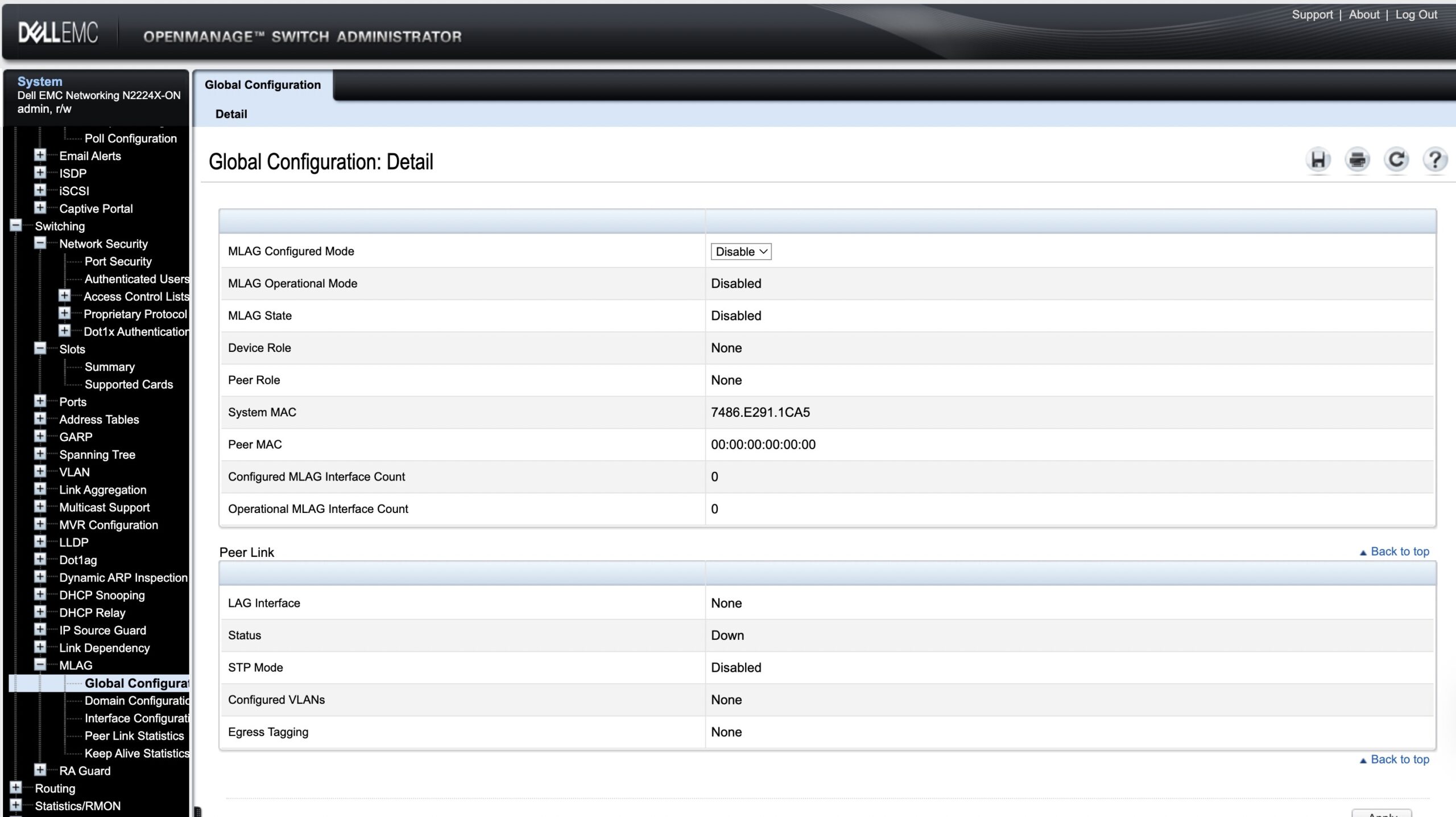 Dell N2224X ON OpenManage Switch Administrator MLAG