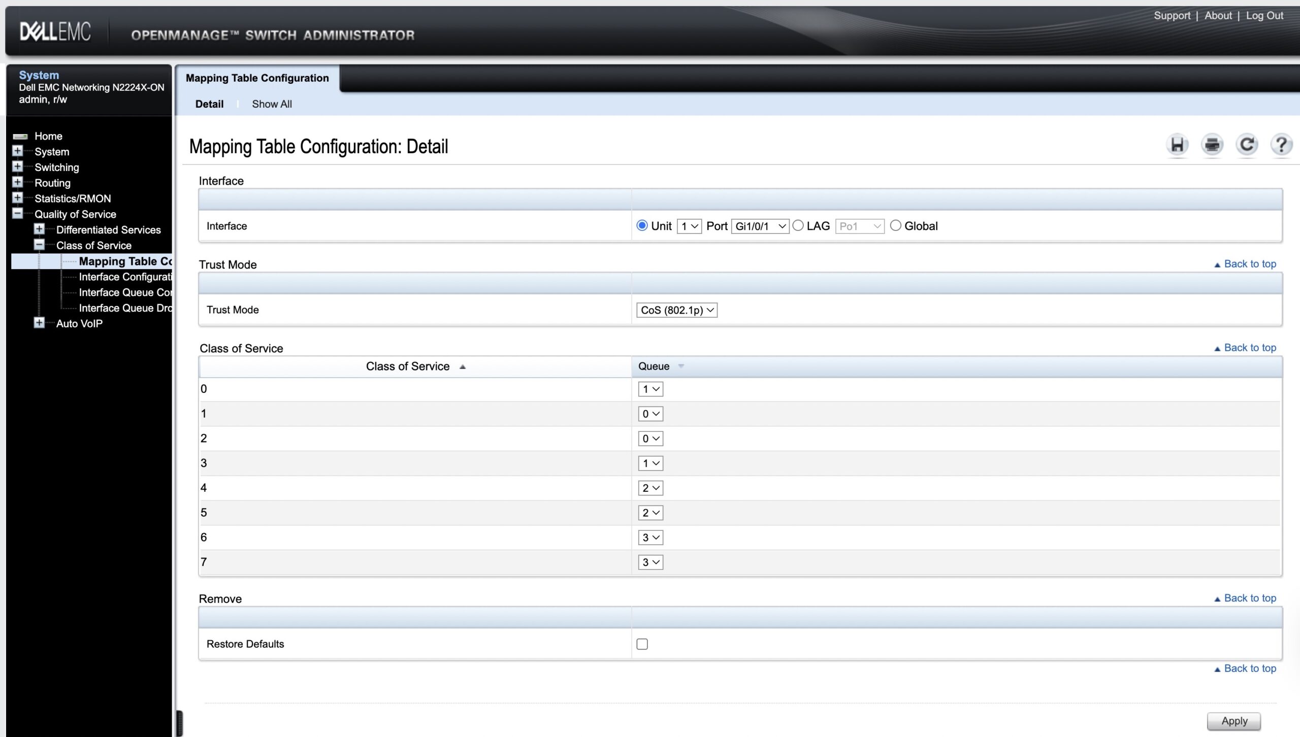 Dell N2224X ON OpenManage Switch Administrator QoS Mapping Table