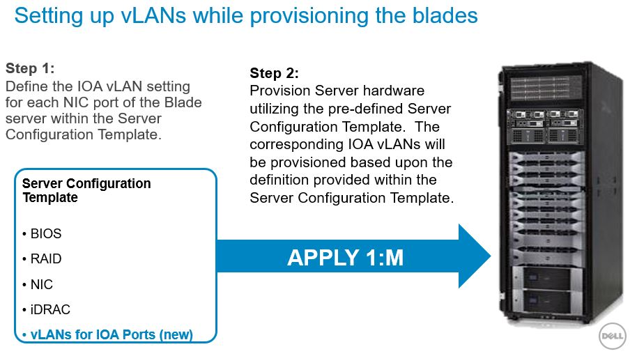 - Template-based provisioning of IO Aggregators including the assignment of vLANs during the blade port mapping process. When blades are provisioned, automating the vLAN assignment within the chassis saves administrators time and solves scalablity concerns. We have seen competing blade products that do not have this template-based provisioning and there is an extra step involved in provisioning networking.