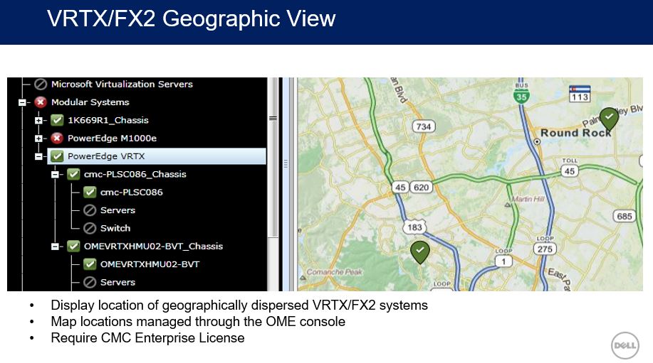 - Geographic View feature helps to quickly locate PowerEdge FX2 systems around the world. This helps administrators locate geographically dispersed systems.