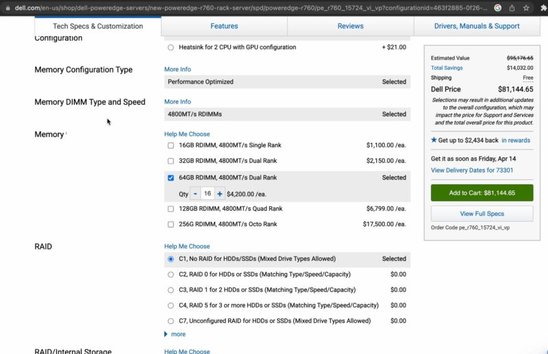 The 32GB DIMM list price is $2150 each. 64GB DDR5 RDIMM? That is $4200. In the video, I said we have been paying less than $400 for 64GB RDIMMs, and I remember from when we did the Why DDR5 is Absolutely Necessary in Modern Servers that the 32GB DIMMs we used, at that time, were under $200 each. Dell’s list prices are more than 10x what we are paying.
