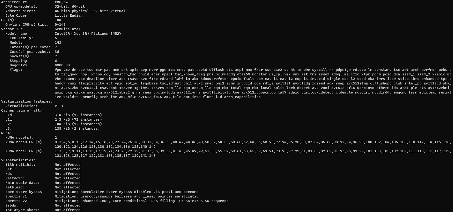 Dell PowerEdge R760 Intel Xeon Platinum 8452Y Lscpu Output