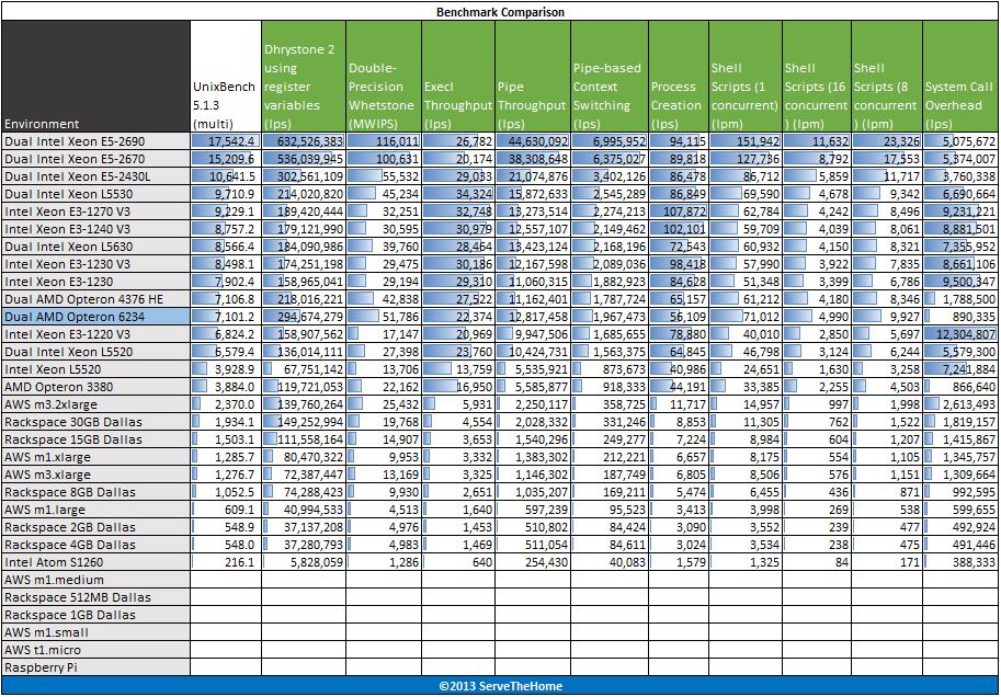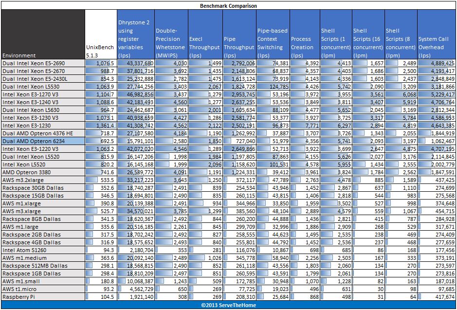 UnixBench may be a defacto standard for Linux benchmarking these days. There are two main versions, one that tests single CPU performance on that tests multiple CPU performance. UnixBench segments these results. We run both sets of CPU tests. Here are the single threaded results: