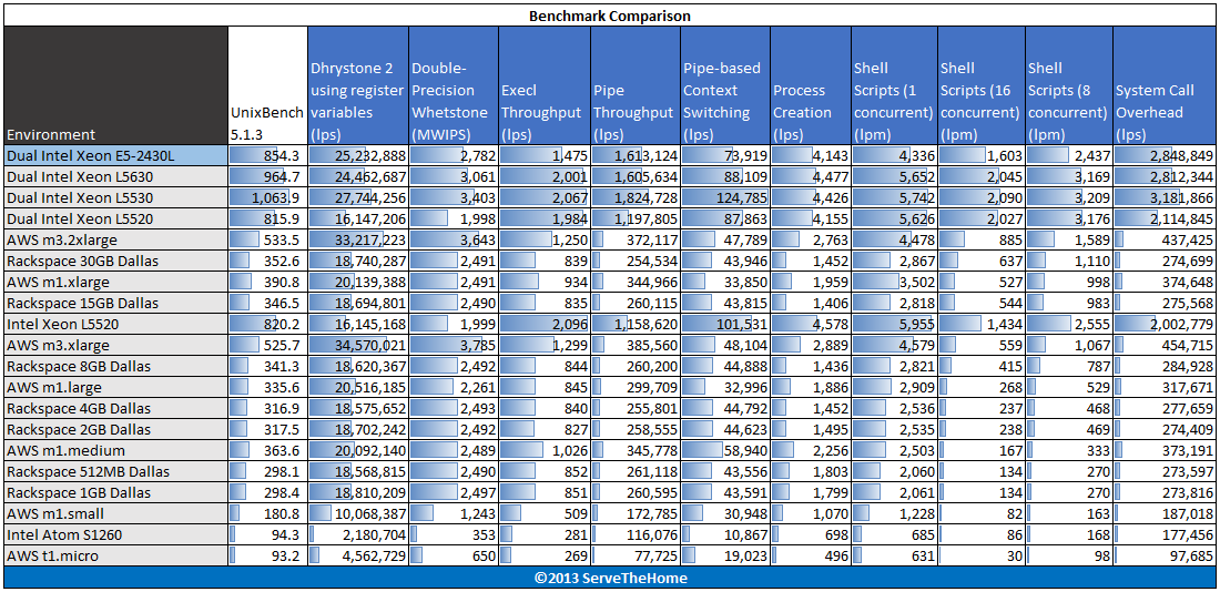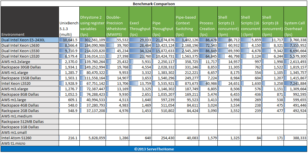 In terms of multi-threaded UnixBench performance the dual Intel Xeon E5-2430L performs very well, showing significant improvement over previous generation processors.