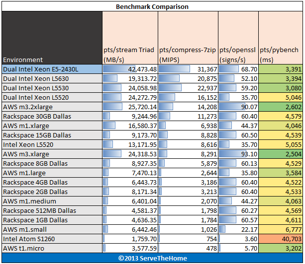We are utilizing our new Linux benchmark suite and Ubuntu Server 12.04 LTS to take a look specifically at the compute performance of these instances. We now have a fairly broad range of Amazon and Rackspace cloud instances benchmarked along with many dedicated platforms. One may see data bars where there is no system sitting at the maximum value. This is because we tend to benchmark ahead of publication so there are many dedicated platforms benchmarked but not published yet.