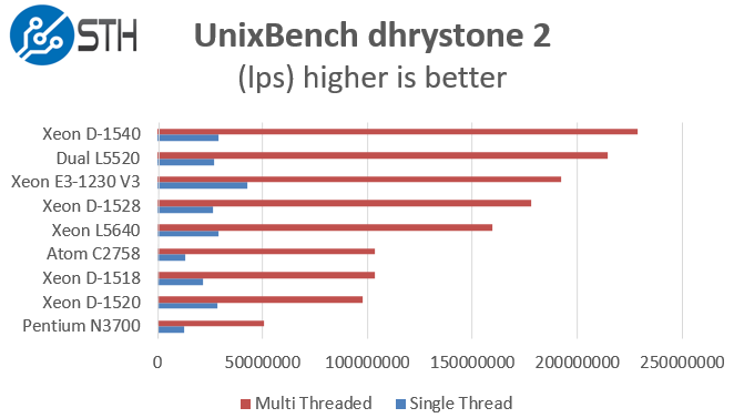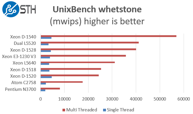 Of course, these chips are not meant for heavy compute but we pick out the UnixBench 5.1.3 Dhrystone 2 and Whetstone results to show some of the raw performance they are capable of. UnixBench is widely used so it is a good comparison point.
