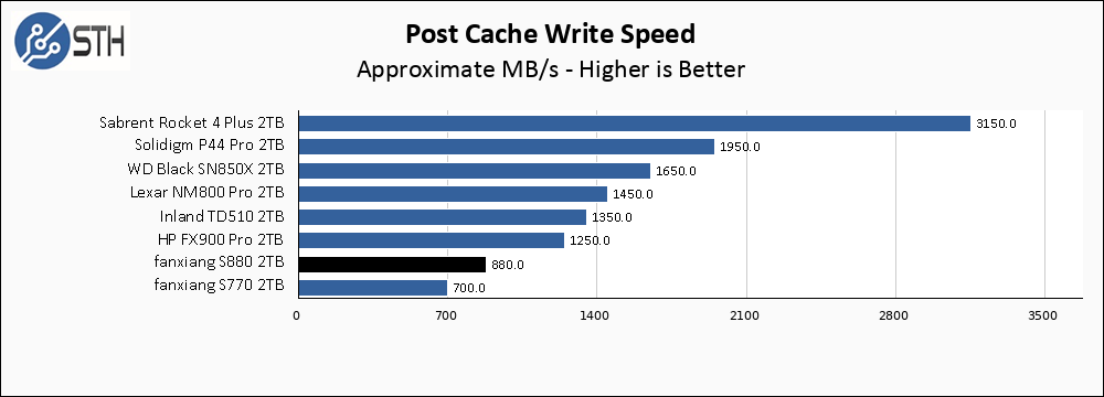 The sustained write performance of the S880 is around 880 MB/s, which is fine and better than the S770. Lots of drives that I have not included in this chart come in significantly lower, so the S880 is absolutely fine here.