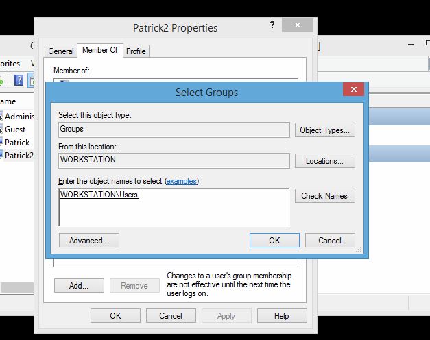Right clicking on the dummy account Patrick2 and going to properties, I removed it from the group “Users” and added it to the group “Administrators”. This is very straightforward and one can simply type in Administrators then click Check Names and it will validate and auto-populate the domain.
