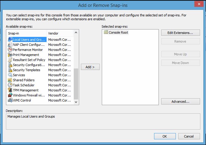From there you will see the management console where you will then want to go to Add or Remove Snap-ins. From the list, scroll down to Local Users and Groups as pictured below. Then click Add.