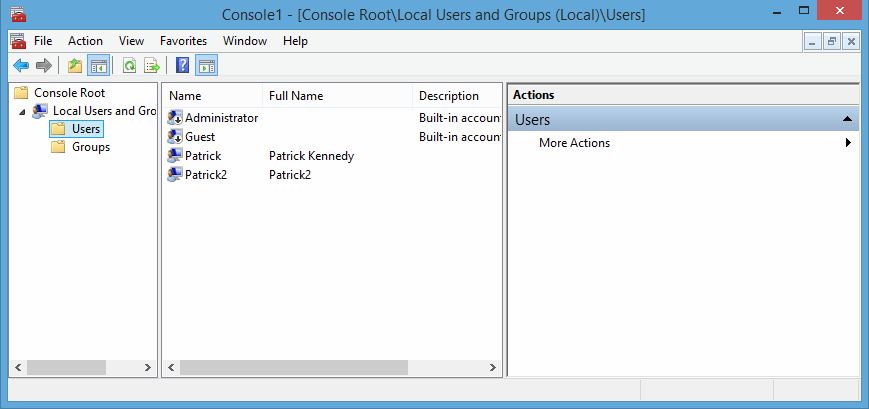 From this point, you can use the tree on the left to see currently installed users. There are a number of ways to go about this but one good way is to create a new account. For reference, Patrick was the existing account and Patrick2 is the dummy account created from the More Actions dialog below.