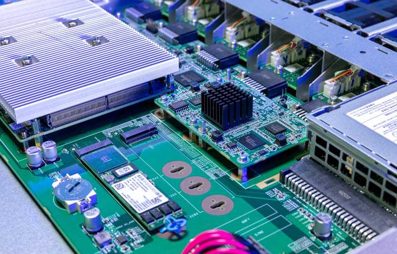 First, there is a M.2 SSD and two slots available. Based on the model number, this looks like an Intel (now Solidigm) Intel D3 S4510 240GB SATA SSD with onboard PLP. Even though the system is hard to get into, we see a nice tool-less M.2 retention mechanism here.