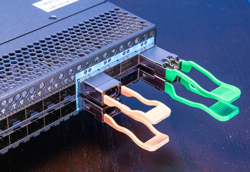 Here are the two QSFP28 modules in the switch. The QSFP28-100G-SR4 modules have the beige looking pull release tabs while the QSFP28-100G-IR4 have green tabs. QSFP28 decodes to quad small form-factor pluggable 28(Gbps). That means that there are effectively four channels that can each carry 28Gbps. while that may sound like they should be 112GbE, but conceptually you can this of this as there is room for overhead so this is 100GbE.