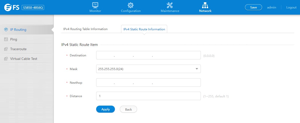 FS S5850 48S6Q Management IPv4 Static Route