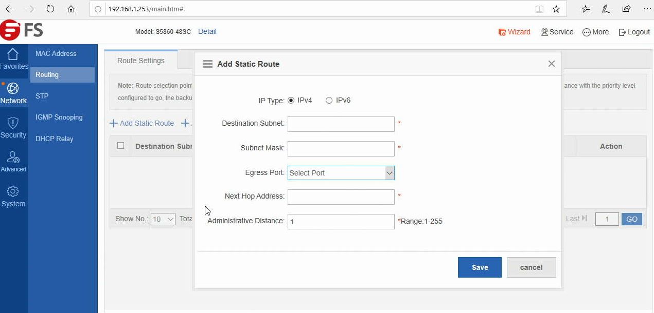 FS Management Web Add Static Route