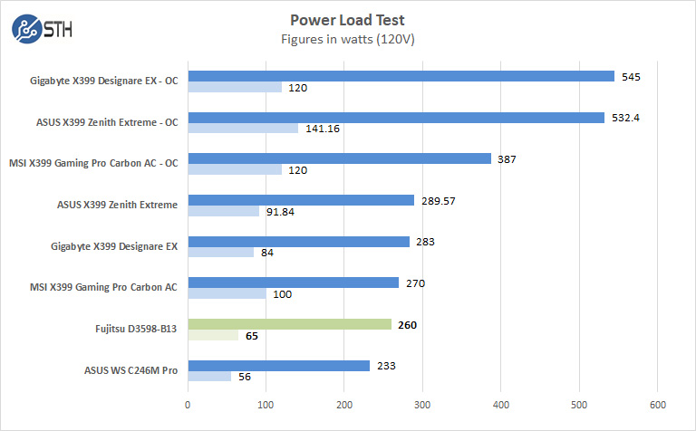 For our tests, we use AIDA64 Stress test which allows us to stress all aspects of the system. The Fujitsu D3598-B13 with Intel Xeon processor W-2123 uses little power, the bulk of the power draw we see is coming from the RTX2060. We were frankly surprised by how little power this system used given the LGA2066 platform.
