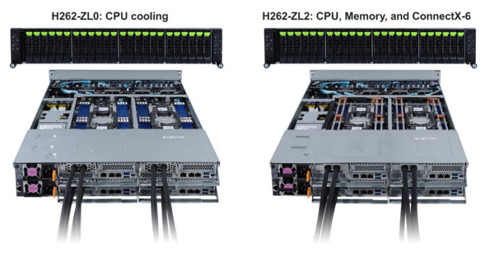 The first is the Gigabyte H262-ZL0 that puts cold plates on the two CPUs, but then relies upon air cooling for the rest of the system. The Gigabyte H262-CL2 adds additional cold plates in its loops for cooling the DDR4 modules as well as a Mellanox/ NVIDIA ConnectX-6 fabric adapter.