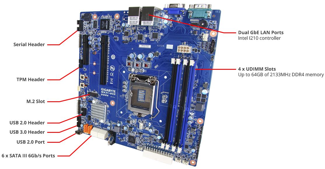 - 4 x DDR4 DIMM slots supporting up to 64GB of ECC memory