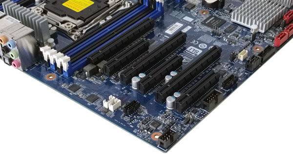 Here we see the standard PCIe layout for the MW70-3S0. In this arrangement PCIe slot #6 sits right next to the memory slots which is a tight fit. Be sure to check for clearance if your RAM sticks include heat spreaders.