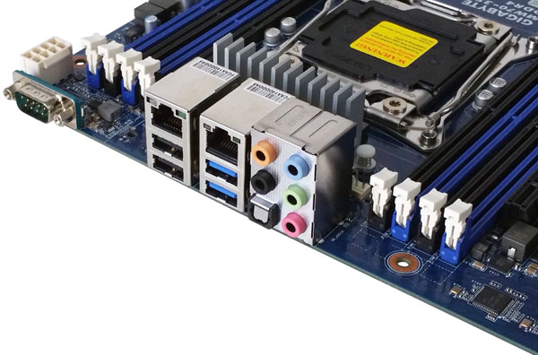 At the back of the motherboard we find a serial Port, 2x USB 2.0, 2x USB 3.0, 5x audio jacks plus S/PDIF optical output and 2x Gigabit Ethernet LAN ports.