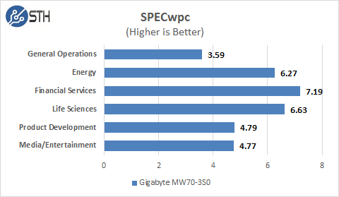 SPECwpc results can vary by a large amount depending on the GPU and Storage drives used. Several results can be boosted by using a higher end GPU. The MW70-3S0 does have very good results for Financial Services and Life Sciences.