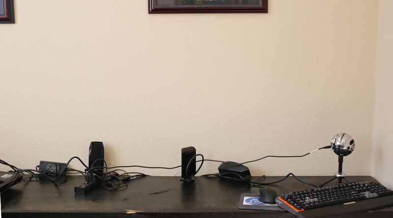 The first step was removing the monitors. They took up so much space that a litany of peripherals and wires found themselves tucked away behind the monitor. For those wondering, the speakers are an inexpensive Logitech set of unknown origin. They are rarely used but had fallen victim to the behind monitor tug-of-war due to other peripherals being installed/ removed.