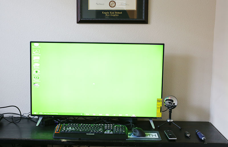 After taking the opportunity to move some of these peripherals around, one can see the Vizio M43-C1 placed in the same spot. The monitor is taller but nowhere near as wide as the HP ZR 30w’s. I left two degrees framed just to give some reference point above the desk. The gap between the desk and the monitor and the monitor and the Juris Doctor degree both shrunk considerably with the new panel. In terms of width, the Vizio M43-C1 is not as wide as the combined width of the two HP ZR30w’s, but is much wider than one of them.