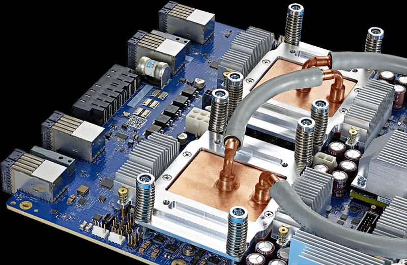 There are other changes, however, at the system level, we have 4x the number of accelerator chips but 9-10x the petaflops and 8x the memory. We can also see a big change to the cabling connectors on the left side of these nodes.