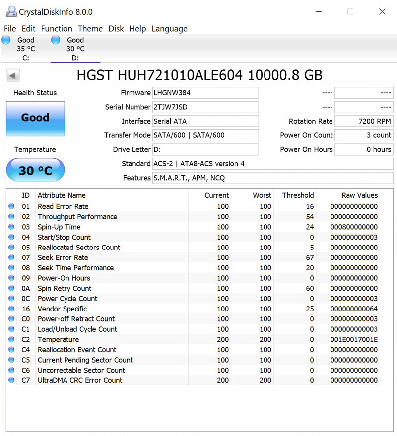Using CrystalDiskInfo we see the HDD information. Most hard drives today hit spindle speeds of 7200rpm, especially as helium-filled drives become more commonplace. The move from air to helium coincided with drives that ran cooler and more reliably which has been an underappreciated innovation in the industry.