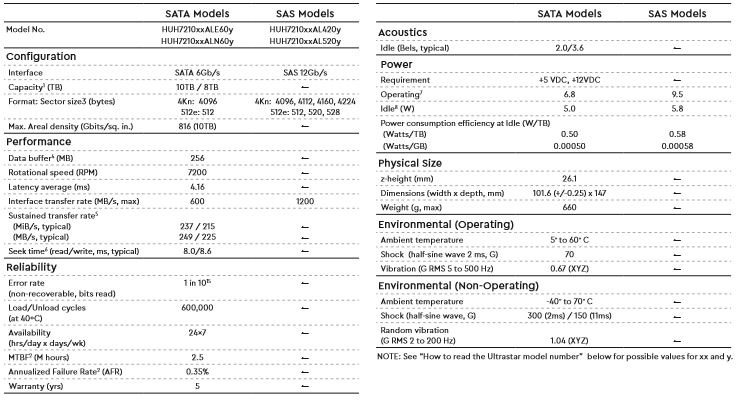Here are the official specs from HGST / Western Digital on the Ultrastar DC HC510 10TB hard drive: