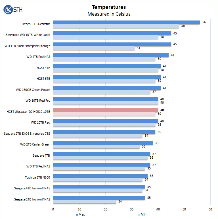 Overall the HGST WD Ultrastar DC HC510 10TB drive runs cool and at the middle of the pack when running benchmarks. The difference between idle and Max temperatures is small at a 1C difference.
