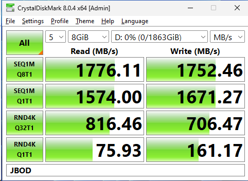 The performance here is actually pretty encouraging. Write speed in RAID 1 is limited to the performance of a single disk as you might expect, but read speed is pulling data from both drives and performs well. This is the configuration I will be using in my server build, and these results are fully acceptable for my deployment.