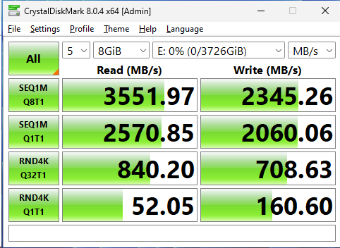 Lastly, I did test a 4-drive RAID 0 array and achieved the best performance to date. These results are in line with expectations of a saturated PCIe Gen 3 x8 interface.