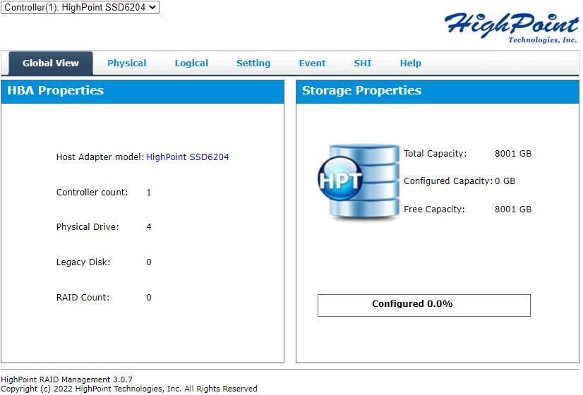 On Windows, the management of the SSD6204 is handled through HighPoint’s RAID Management GUI.
