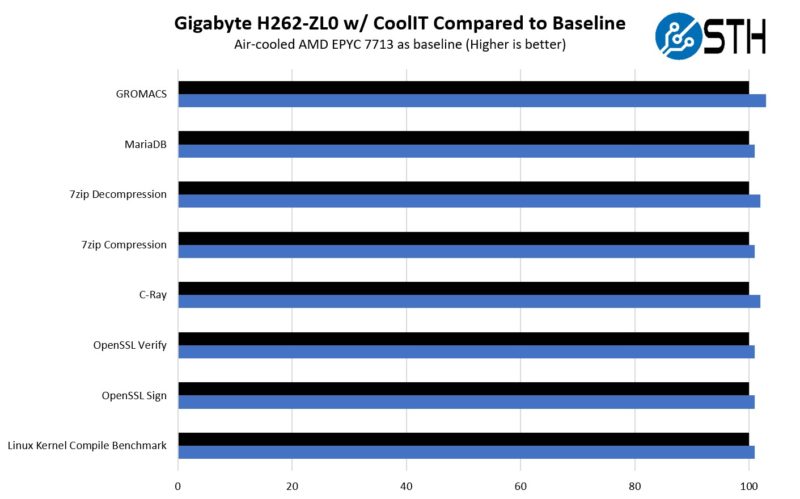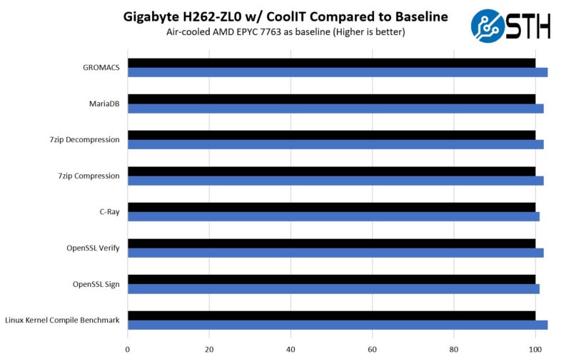 Somewhat by design, and somewhat guided by the fact that STH does not have eight AMD EPCY 7763’s (and I picked up the AMD EPYC 7773X‘s up the day after I got back from Calgary) we used different 64 core EPYC CPUs in the nodes. The overall pattern was the same in that the liquid-cooled processors were able to maintain turbo clocks longer and therefore had slightly better performance, especially when running AVX2 workloads.