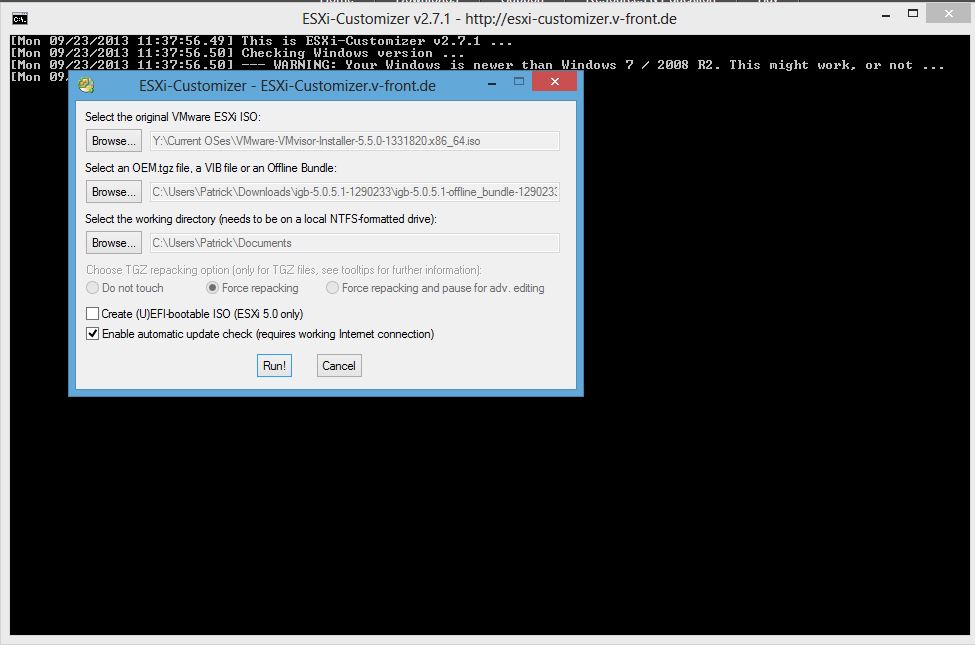 At this point, one needs to get ESXi Customizer as we mentioned in the i210 and i350 piece. One can get it here. Upon running the ESXi Customizer tool, one can simply select the VMware ESXi 5.5 ISO for the first line. For the second line one needs to tell the tool where the new igb drivers are that support the i354 network adapter. One tip here is to extract the drivers then point to the VIB file. The OEM .tgz file did not work in our installation. After that one can point to a working directory and let the tool run.