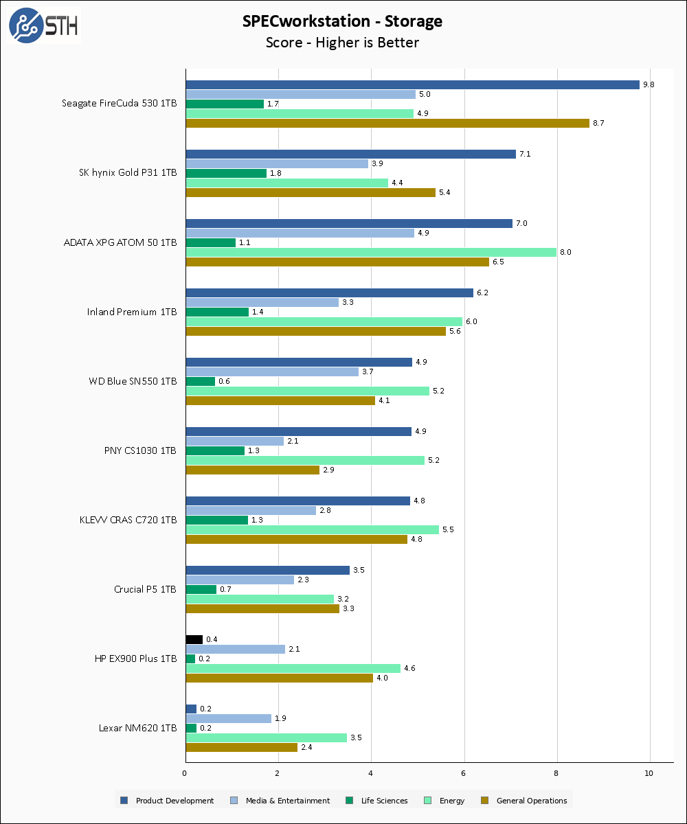 SPECworkstation performance for the HP EX900 Plus is terrible. This drive only managed to avoid the bottom of the graph because I was generous enough to include the Lexar NM620 in the result set, and only beating the Lexar NM620 is a sad standard by which to judge a drive.